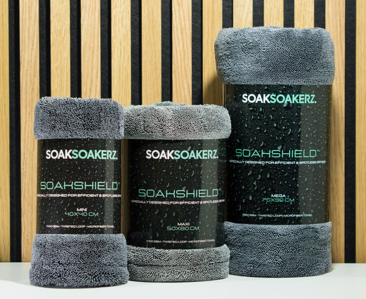 De SOAKSHIELD™ droogdoek is een hoogwaardige, randloze microvezeldoek met twee lagen, beschikbaar in MINI, MAXI en MEGA. Dankzij de Twisted Loop Technologie neemt hij razendsnel water op, voor een krasvrij, streeploos en glanzend resultaat